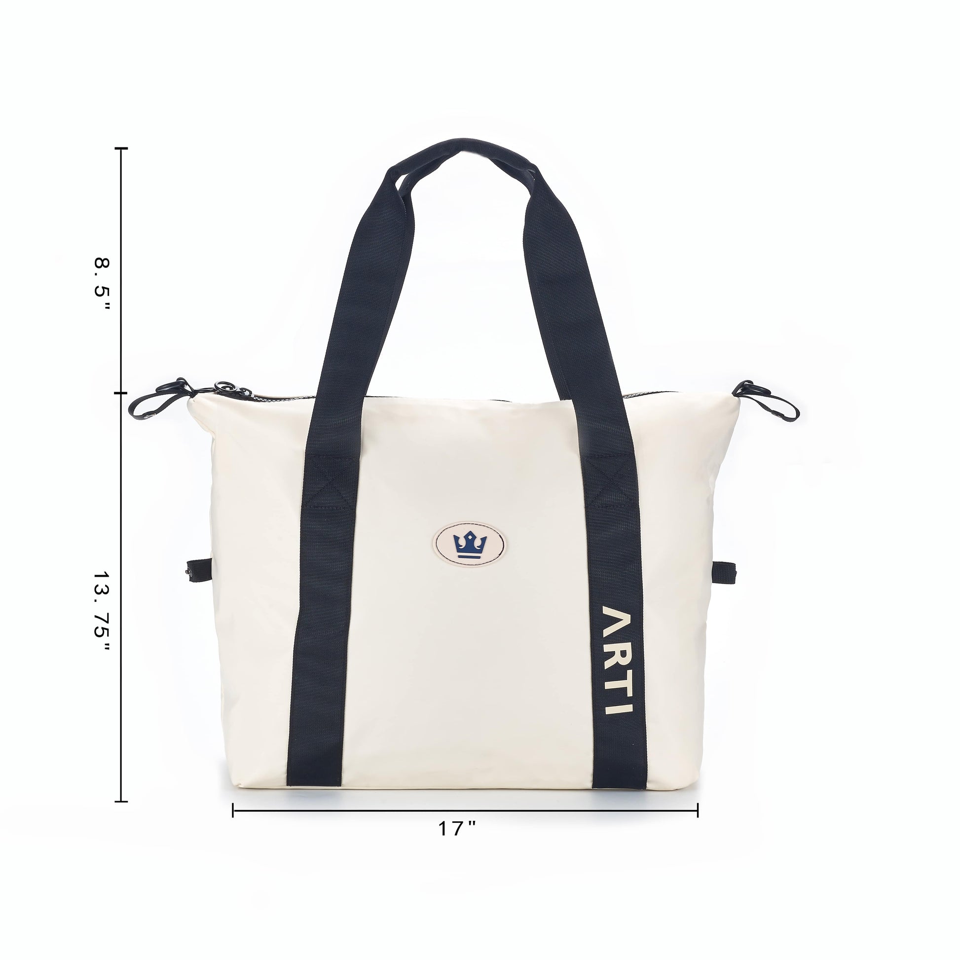 Travel in style and functionality with the ARTI Signature Polyester Duffle Bag in elegant cream, crafted from 100% durable polyester for lightweight strength and weather resistance. Measuring 17" H x 11" W x 6.5" D with sturdy black handles (8.5" drop) and a secure zip-top closure, this versatile duffle is perfect for gym sessions, weekend getaways, or carrying your ARTI essentials. Featuring the iconic ARTI branding in bold black lettering and our signature crown emblem, this bag combines modern design with a touch of sophisticated flair. Complete with adjustable side straps for added convenience, it’s the ideal companion for active lifestyles—pair it with your ARTI paddle set for a cohesive look. Easy to clean and built to last, this cream duffle embodies ARTI’s commitment to quality, creativity, and practicality.