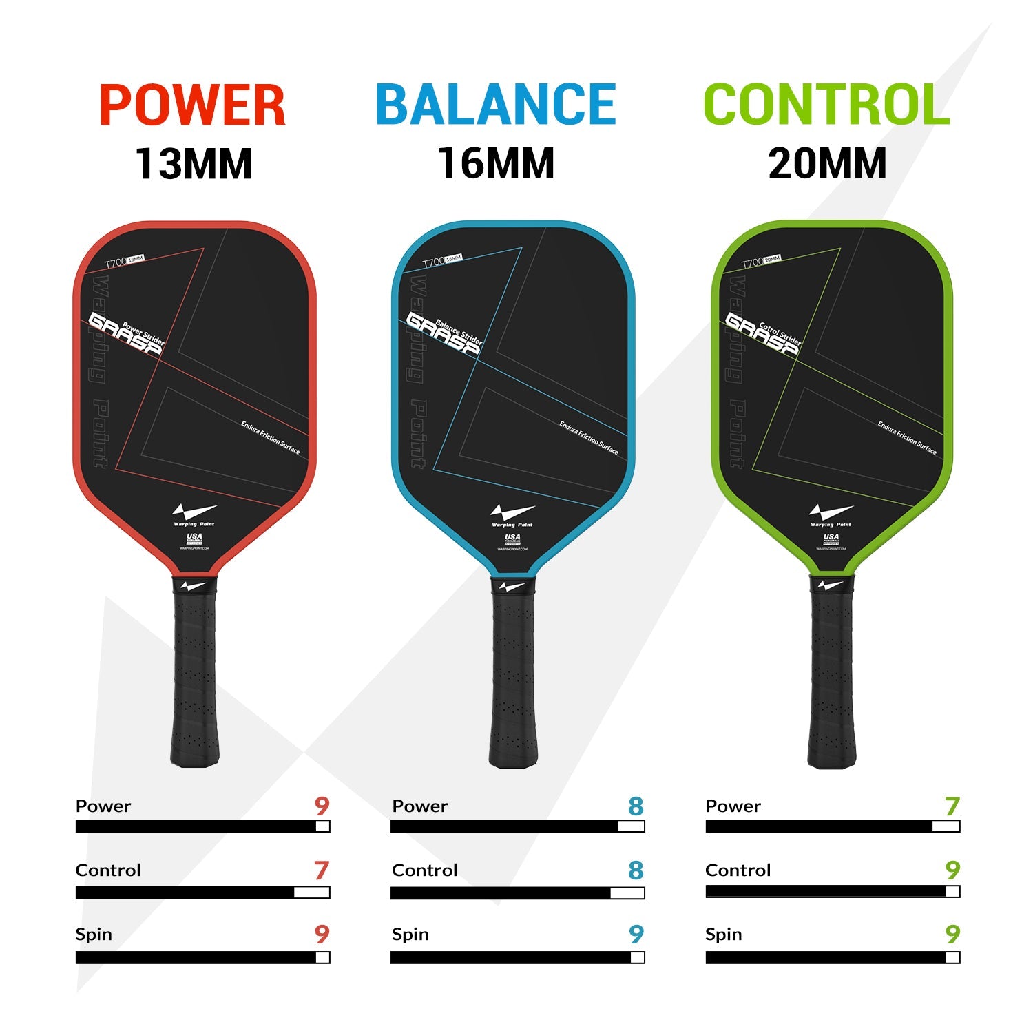 The Grasp Power Pickleball Paddle 13mm by Warping Point reduce control and feel, but it provides extra power and flexibility. This makes your Smash, Drive, Serve, and Volley shots stronger and more aggressive, helping you take control of the game and pressure your opponent.