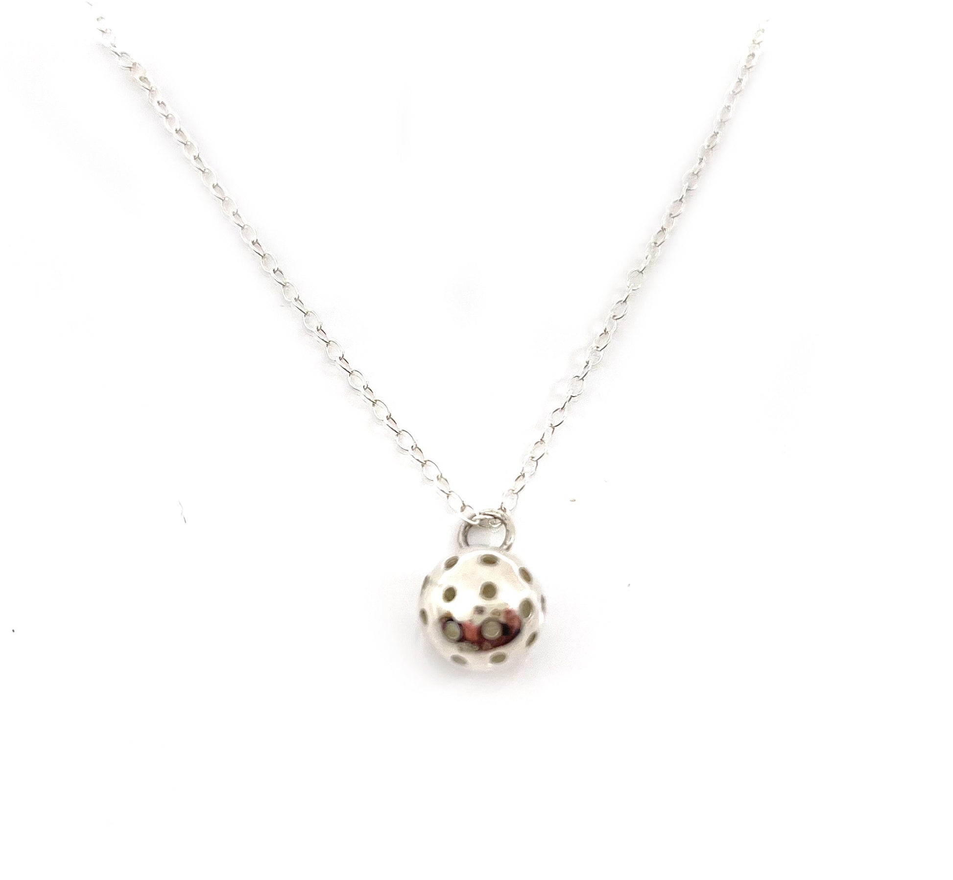 Wear this pickleball-inspired Sterling silver necklace as a symbol of your love for the game. made with an 18 inch chain with secure lobster clasp.
