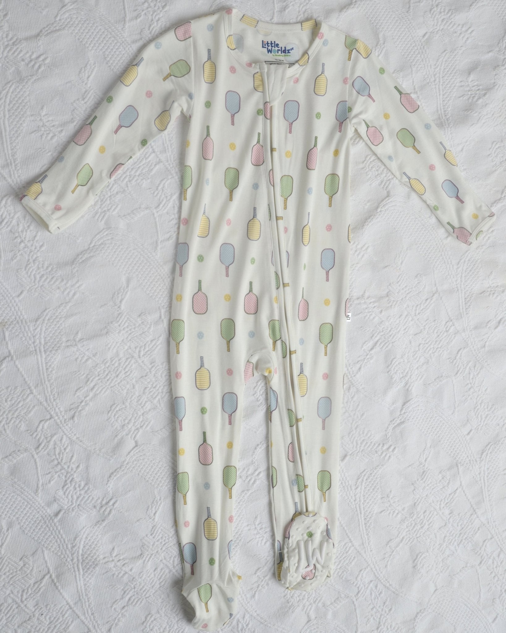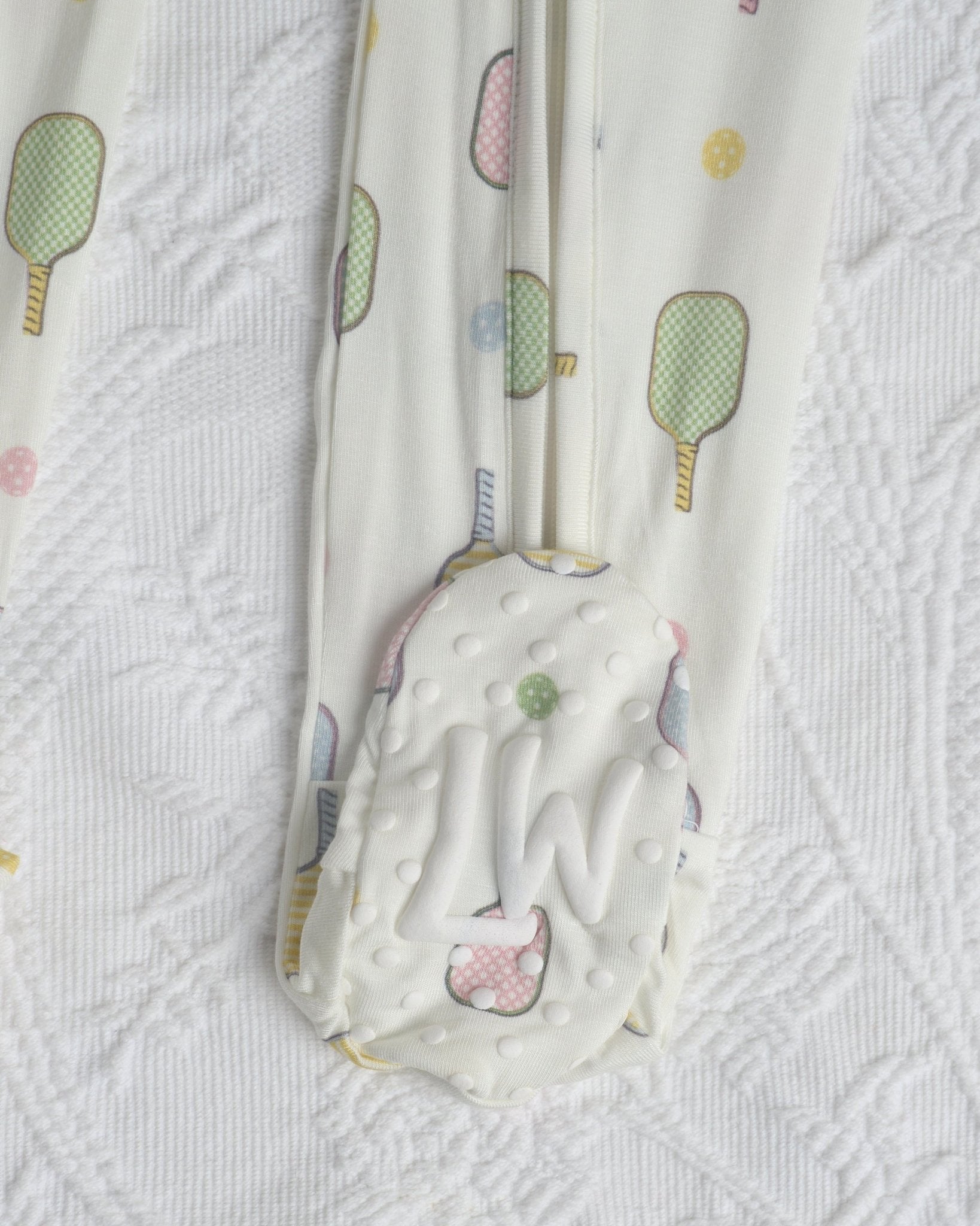Get your baby in on the pickleball action with our Pickleball Bamboo Onesie! Made from our comfortable viscose bamboo fabric this onesie features adorable pickleball paddles and balls. Designed with a two way zipper for quick changes and grippy soles for your active little one, this onesie is an absolute serve for any pickleball-loving family. Game on, baby!